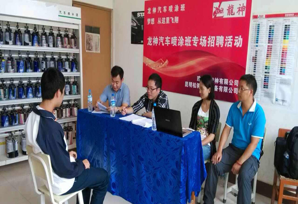 珠海龍神有限公司攜手昆明松騁汽修設(shè)備有限公司與昆明市官渡區(qū)職業(yè)高級(jí)中學(xué)建立更深層次的校企合作關(guān)系,開(kāi)辦龍神噴涂班?,F(xiàn)場(chǎng)選拔面試會(huì)已于2014年6月24日在昆明市官渡區(qū)職業(yè)高級(jí)中學(xué)隆重舉行!